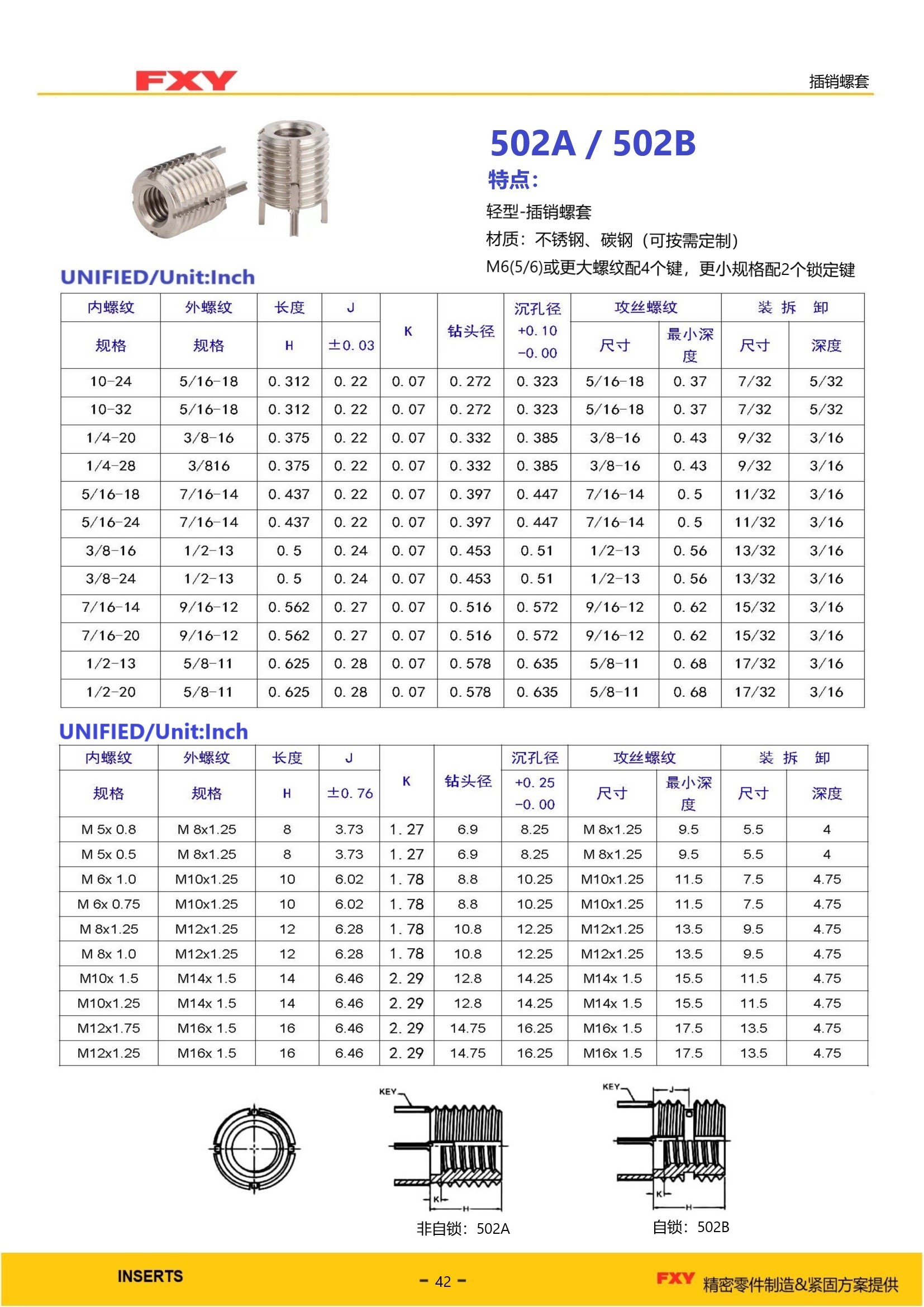 型号:502技术特点: 1、轻型插销螺套 2、增强抗震、抗拔及螺纹强度 2、材质不锈钢、碳钢可按需定制