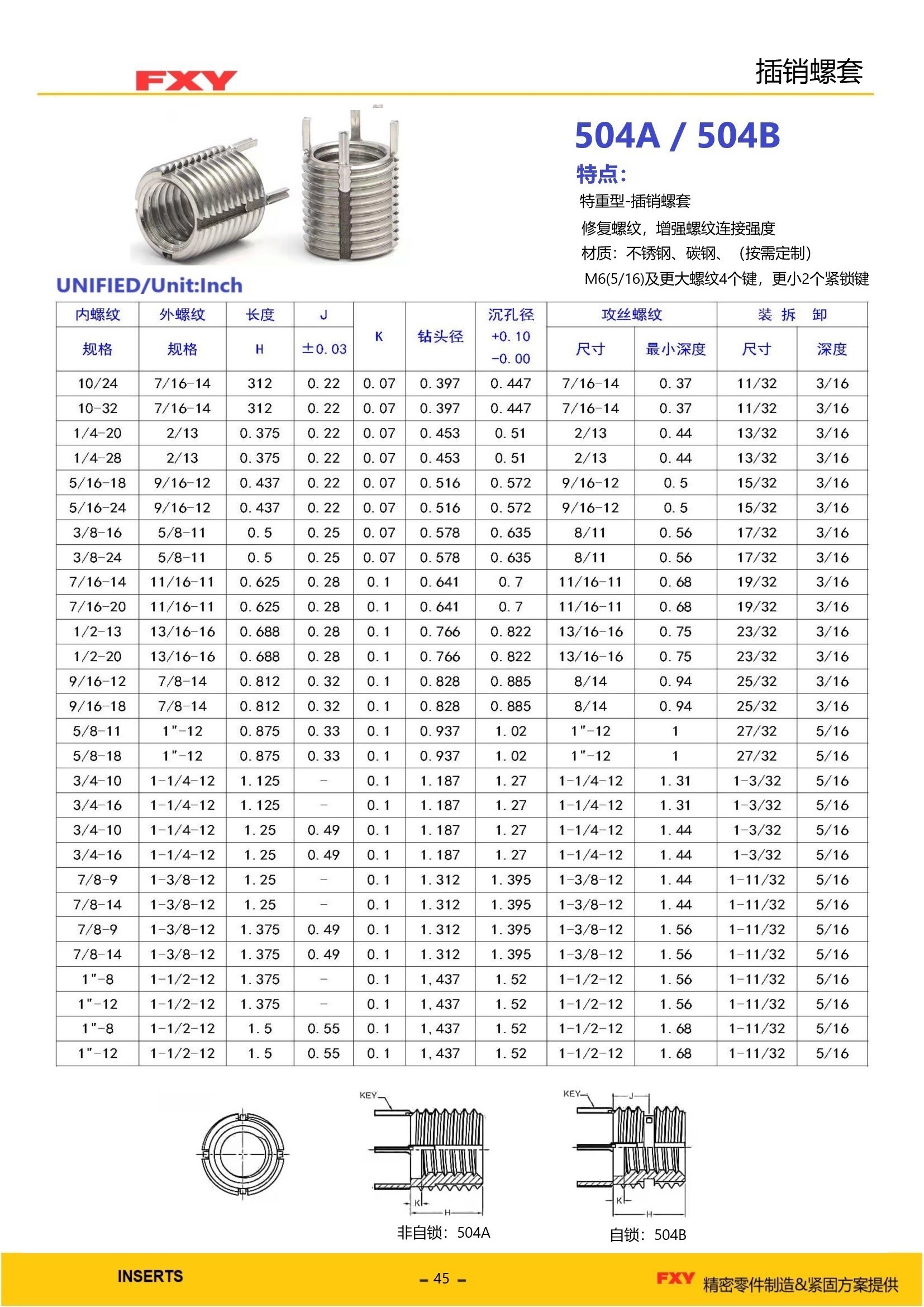 插销螺套*基本的功能就是修复内螺纹和增强外螺纹。插销螺套作为一种螺纹修复手段,可以对被损螺纹进行快速有效地修复;插销螺套应用在低强度的材料上,能极大地增强螺纹孔的强度。