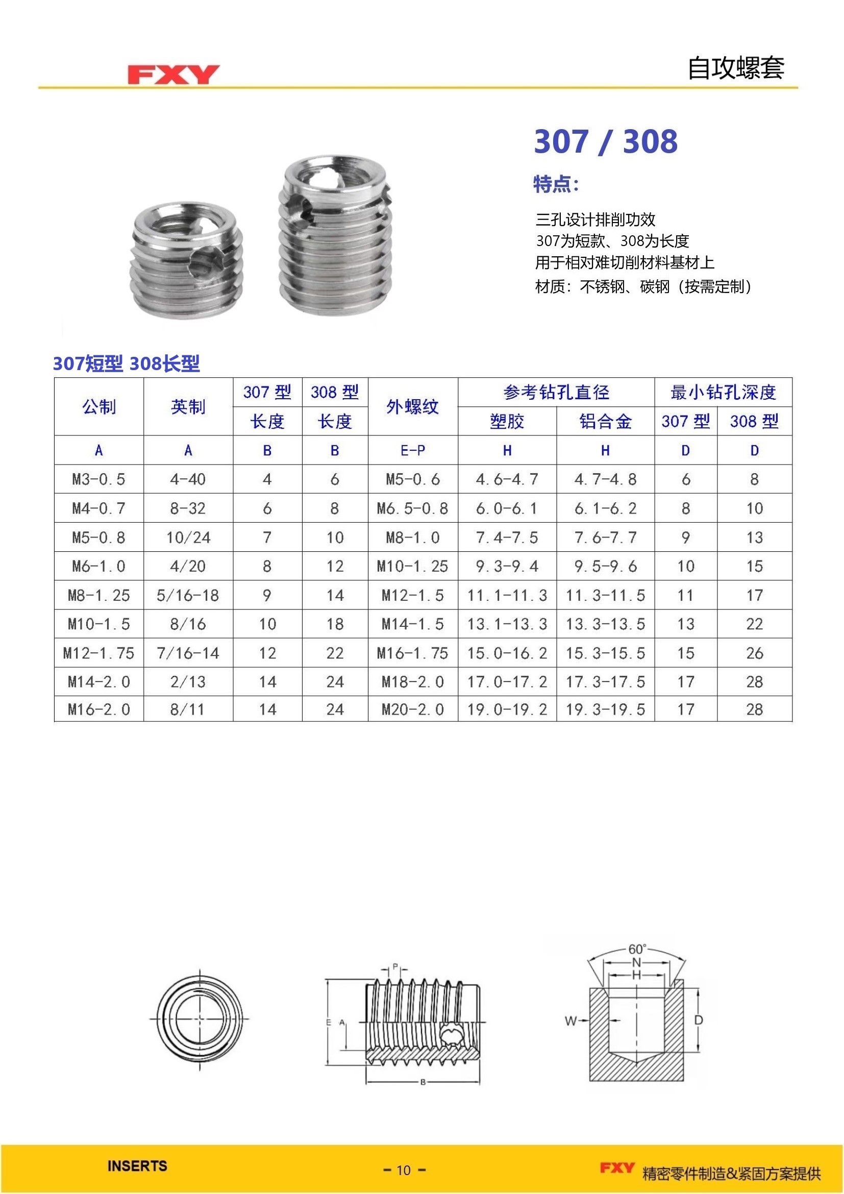 ◆自攻螺套安装简便、迅速,只须一种装配工具,成本低,几乎无不良率。 自攻螺套的材质: 自攻螺套采用的材质一般为碳钢和不锈钢两种