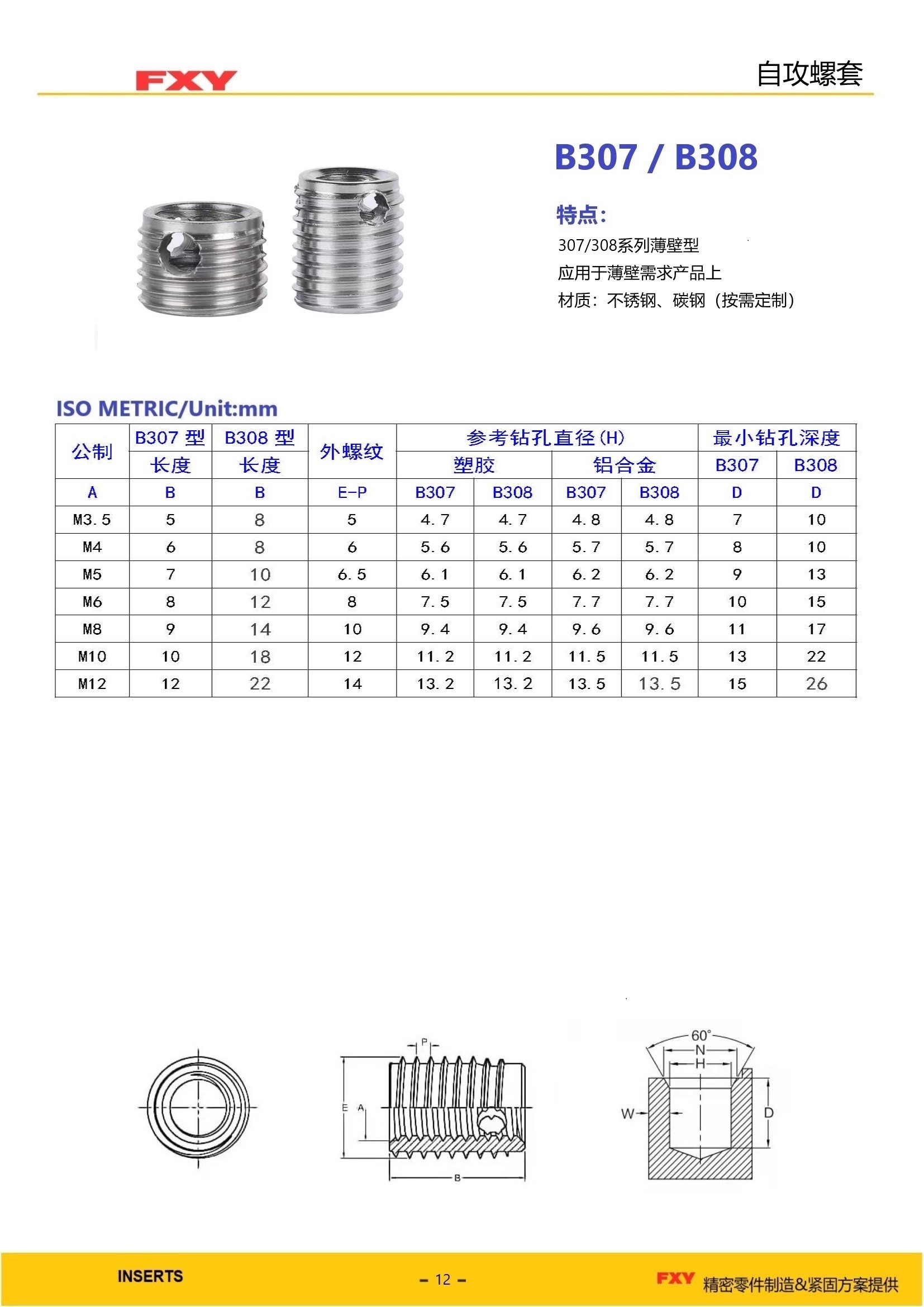 ◆自攻螺套安装简便、迅速,只须一种装配工具,成本低,几乎无不良率。 自攻螺套的材质: 自攻螺套采用的材质一般为碳钢和不锈钢两种