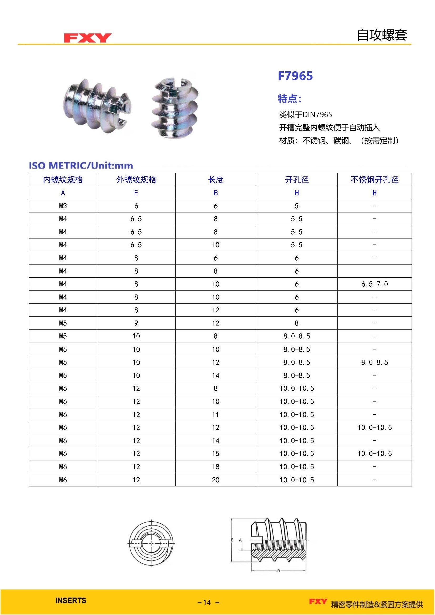 ◆自攻螺套安装简便、迅速,只须一种装配工具,成本低,几乎无不良率。 自攻螺套的材质: 自攻螺套采用的材质一般为碳钢和不锈钢两种