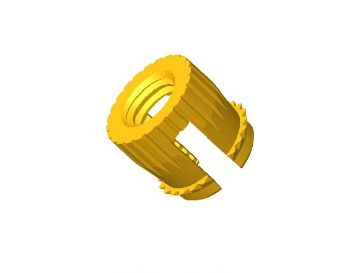 铜螺母使用铜材质(一般是铅黄铜,如H59,H62)制作的螺母,铜螺母具有不易生锈、防腐蚀、易导热及导电性强等优点 ,冷压螺母作为嵌入式铜螺母的一种,主要应用于热塑性塑胶上,也有部分冷压螺母适用于热固性塑胶.冷压螺母的名称来源于它的压入方式,冷压螺母是无需加热,直接按压入塑胶件中的铜螺母.因为特殊的安装方式,因此在设计上为了保证摩擦力,抗扭力和拉力,冷压螺母多设计滚花或逆叶片,很多冷压螺母会有开槽设计,以使螺丝攻入后膨胀,增大摩擦力.