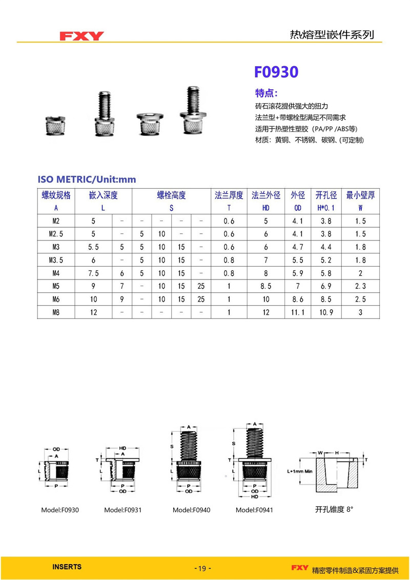 热熔螺母因为安装方式的需求,设计上多为锥形,上有滚花和凹槽,因为安装快速,不需要太复杂的仪器设备,因此应用极为广泛。