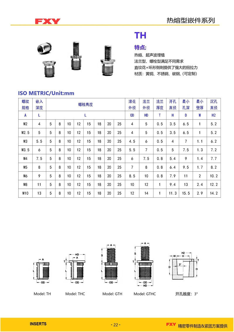 铜嵌件是使用铜材质(一般是铅黄铜,如H59,H62)制作的螺母,铜螺母具有不易生锈、防腐蚀、易导热及导电性强等优点