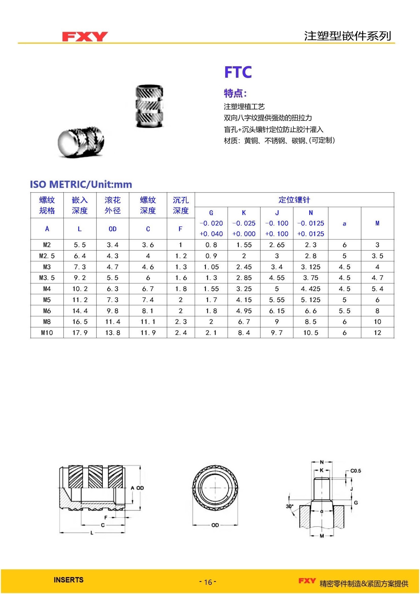 型号:FTC设计特点: 1、双向八字纹提供强劲扭拉力 2、盲孔+沉头定位防止胶汁灌入 3、材质:黄铜、不锈钢、可定制