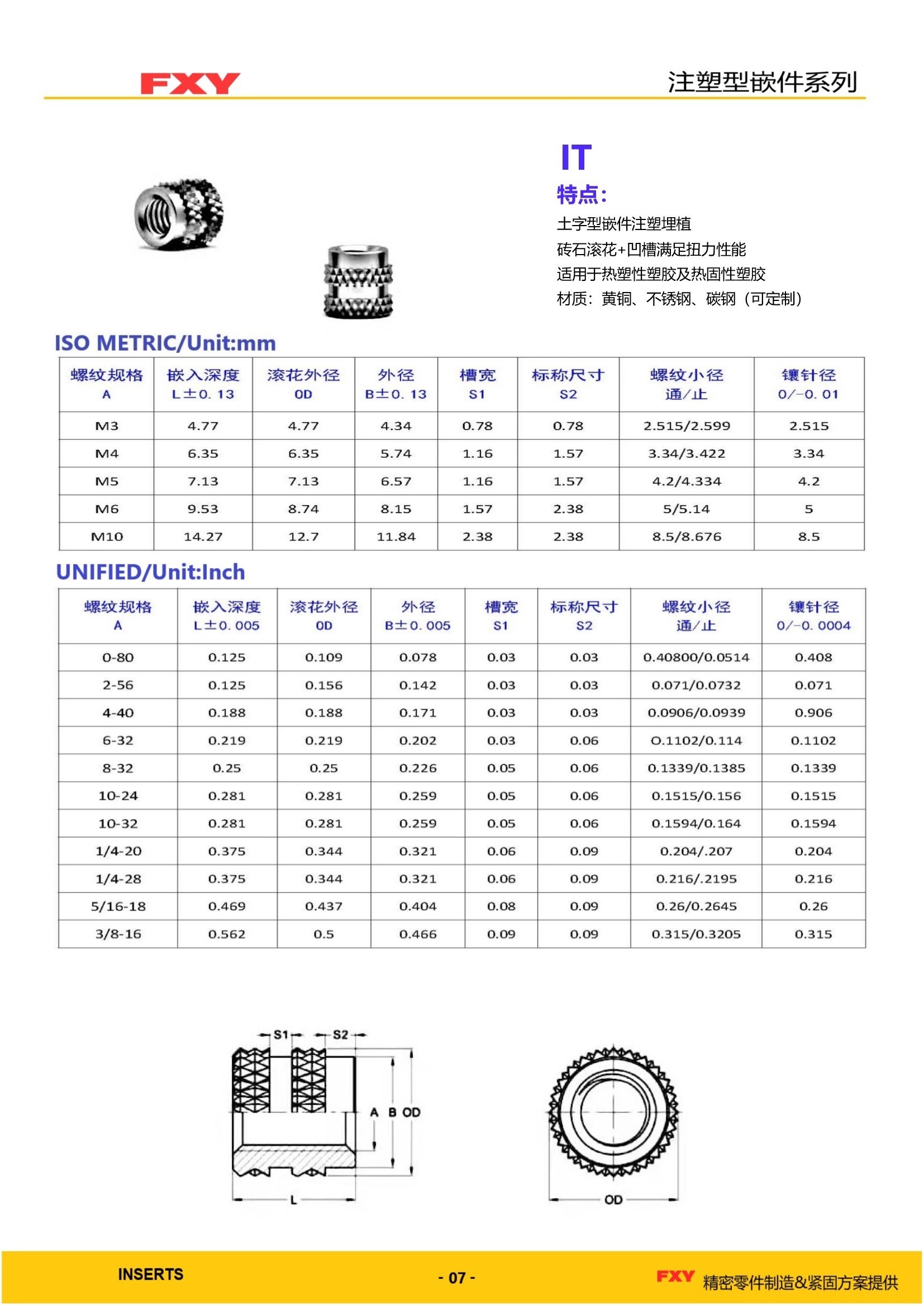 铜螺母使用铜材质(一般是铅黄铜,如H59,H62)制作的螺母,铜螺母具有不易生锈、防腐蚀、易导热及导电性强等优点 注塑螺母作为嵌入式铜螺母的一种,最初的标准来源为GB/T809,但随着现代加工技术的发展,主流的注塑螺母早已脱出了该标准的范畴,有了更繁多的型号,更好的性能和更广泛的应用方式.从外观的角度,目前主流的注塑螺母可以分为钻石滚花螺母,直纹滚花螺母,六角螺母等三种,从开孔上又分为通孔注塑螺母和盲孔注塑螺母两种.