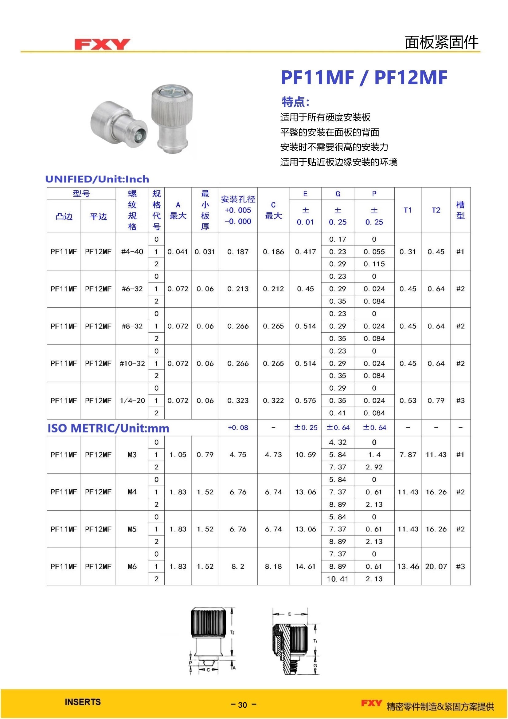 型号:PF11MF/PF11MF技术特点: 1、使用于所有硬度安装板 2、安装不需要很高安装力 3、适用于贴近边缘安装环境