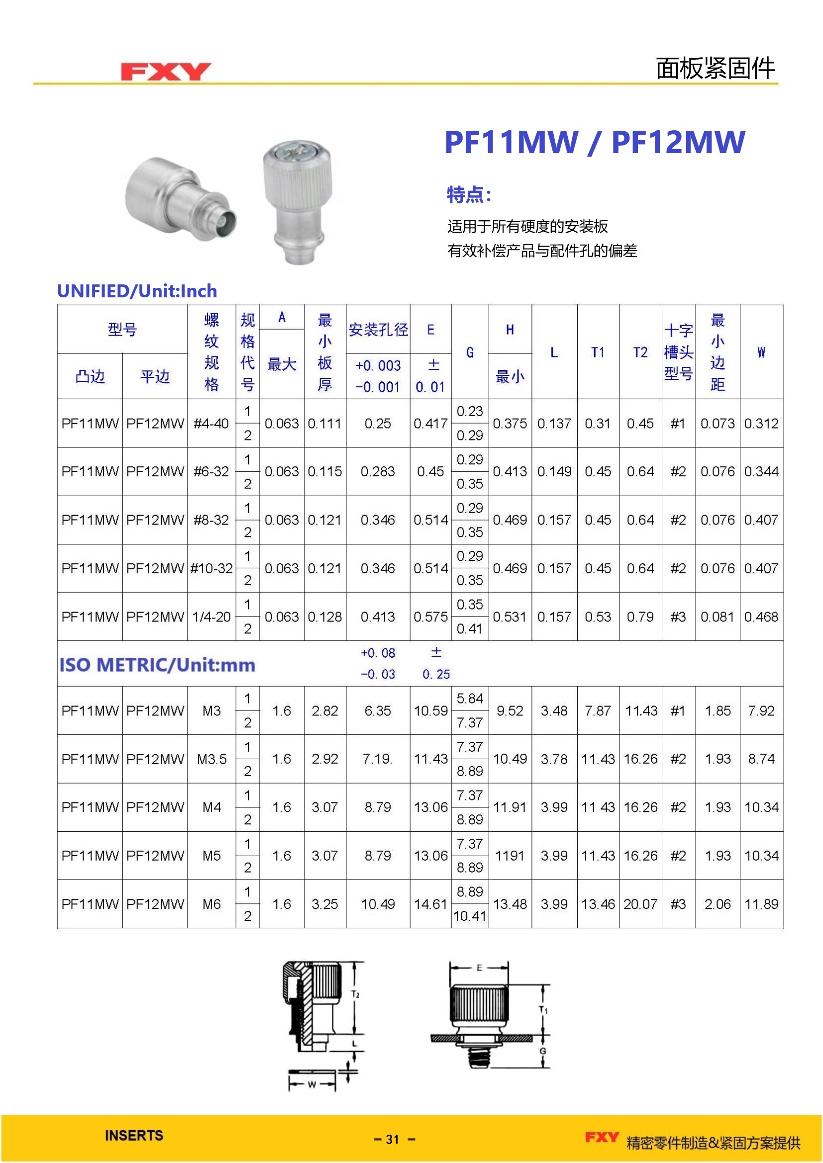 型号:PF11MW/PF11MW技术特点: 1、使用于所有硬度安装板 2、有效补偿产品与配件孔的偏差