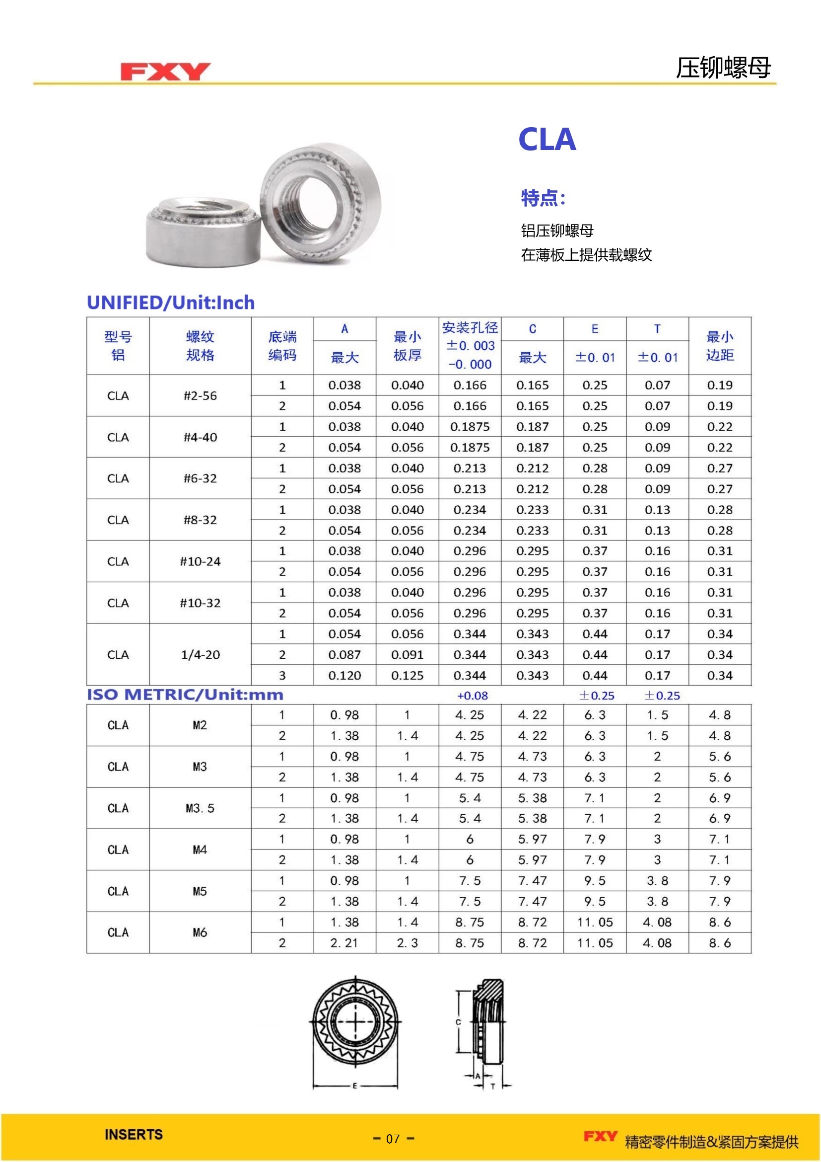 型号:CLA技术特点: 1、铝压铆螺母 2、在薄板上提供载螺纹