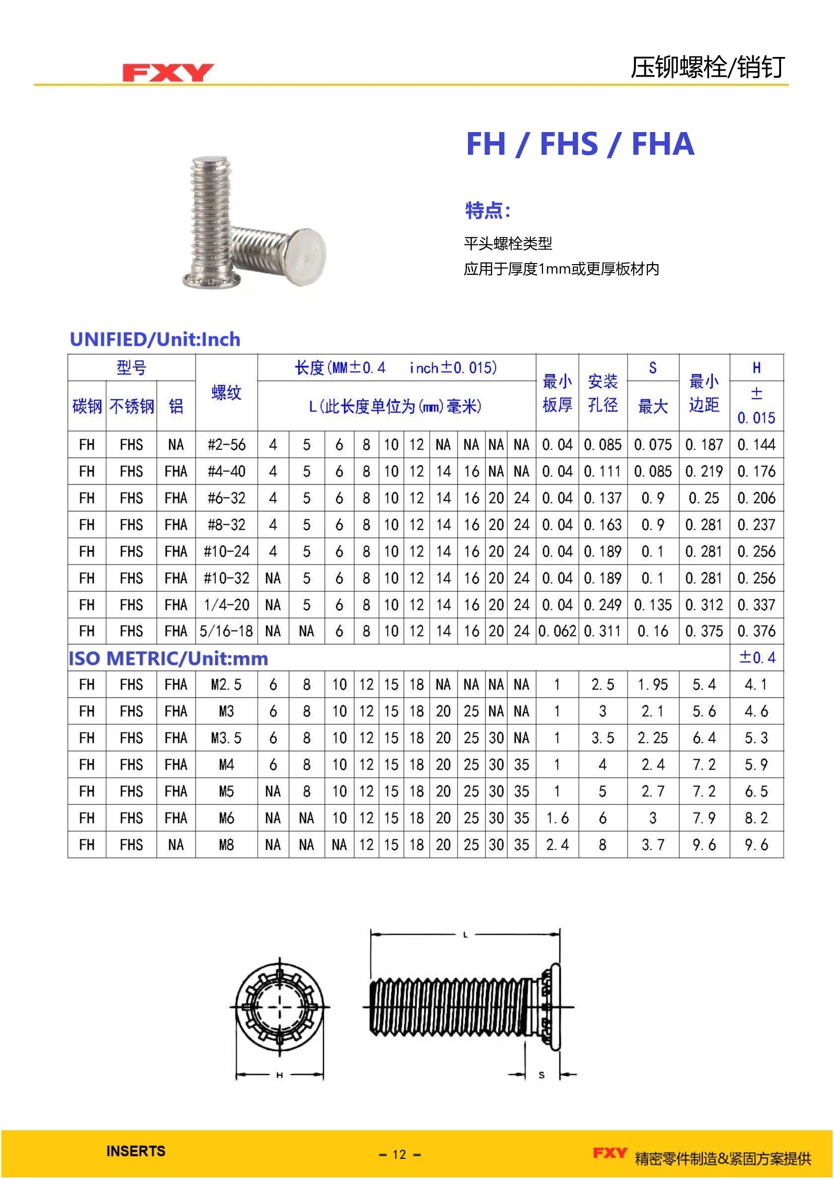型号:FH/FHS/FHA技术特点: 1、平头螺栓型 2、应用于厚度1mm或更厚板内