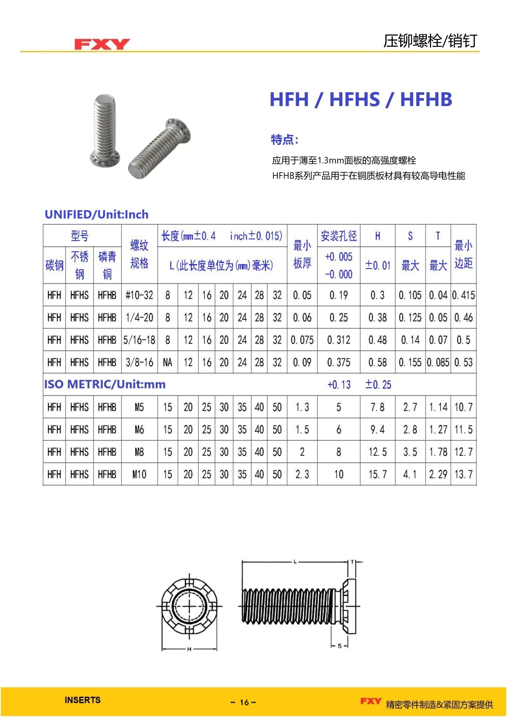 型号;HFH/HFHS/HFHB技术特点: 1、平头设计应用于1mm或更厚不锈钢板材 2、适用于在铜材质具有较高的导电性能