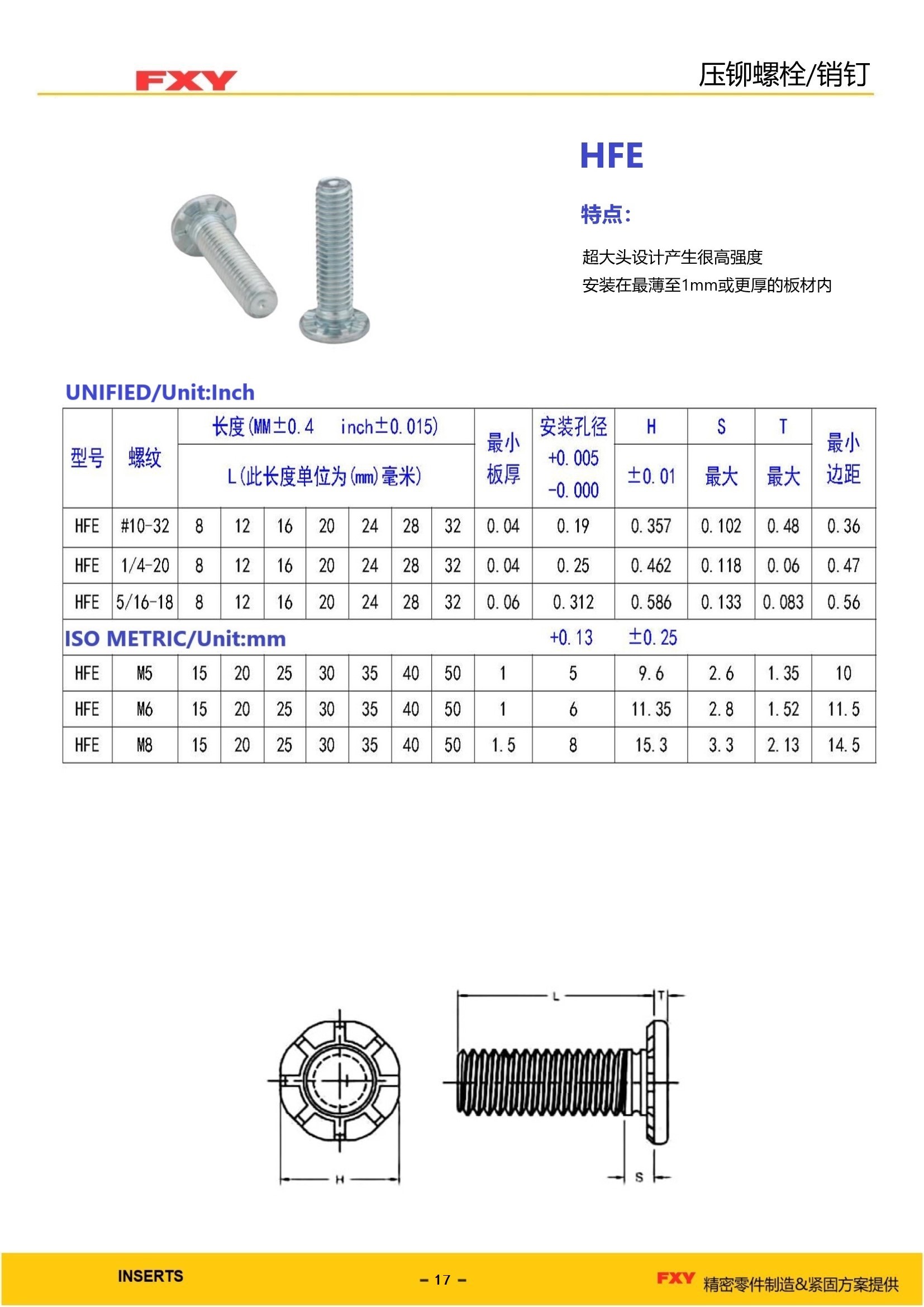 型号;HFE技术特点: 1、超大头设计提高强度 2、适合1mm或更厚薄板上
