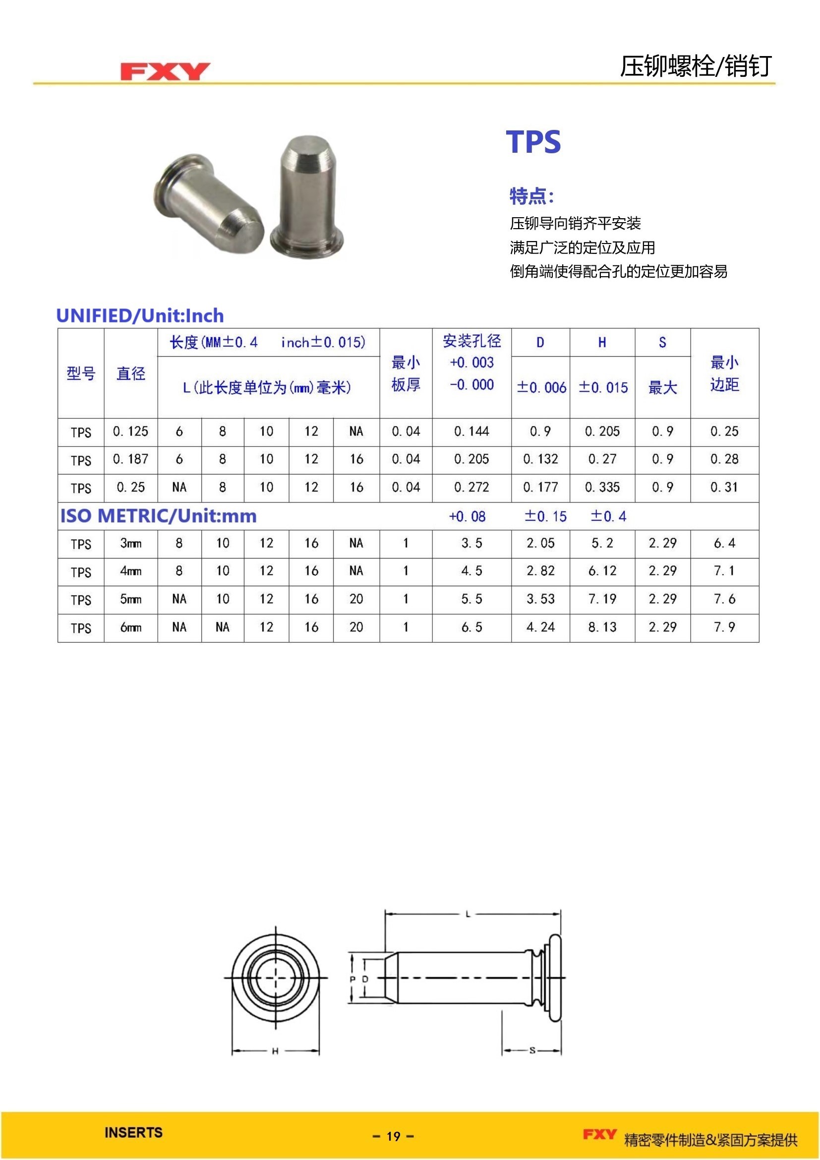 型号;TPS技术特点: 1、压铆导向销齐平安装 2、满足广泛定位及应用 3、倒角端使得配合孔更容易