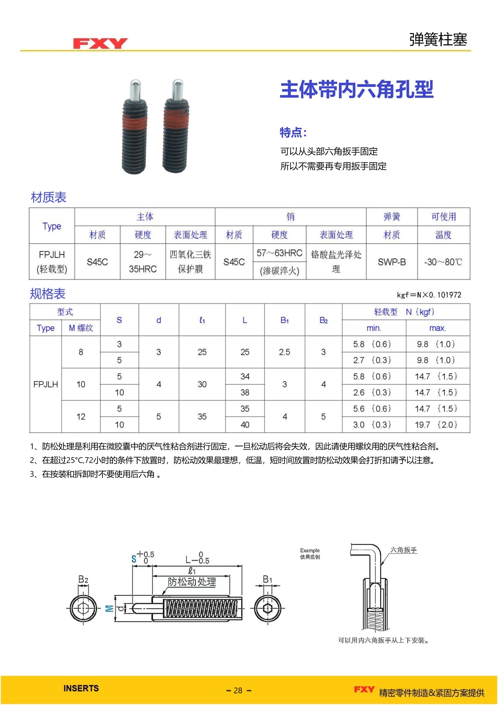 型号:主体带内六角孔型弹簧柱塞HPJLH 1、无需使用专用扳手安装