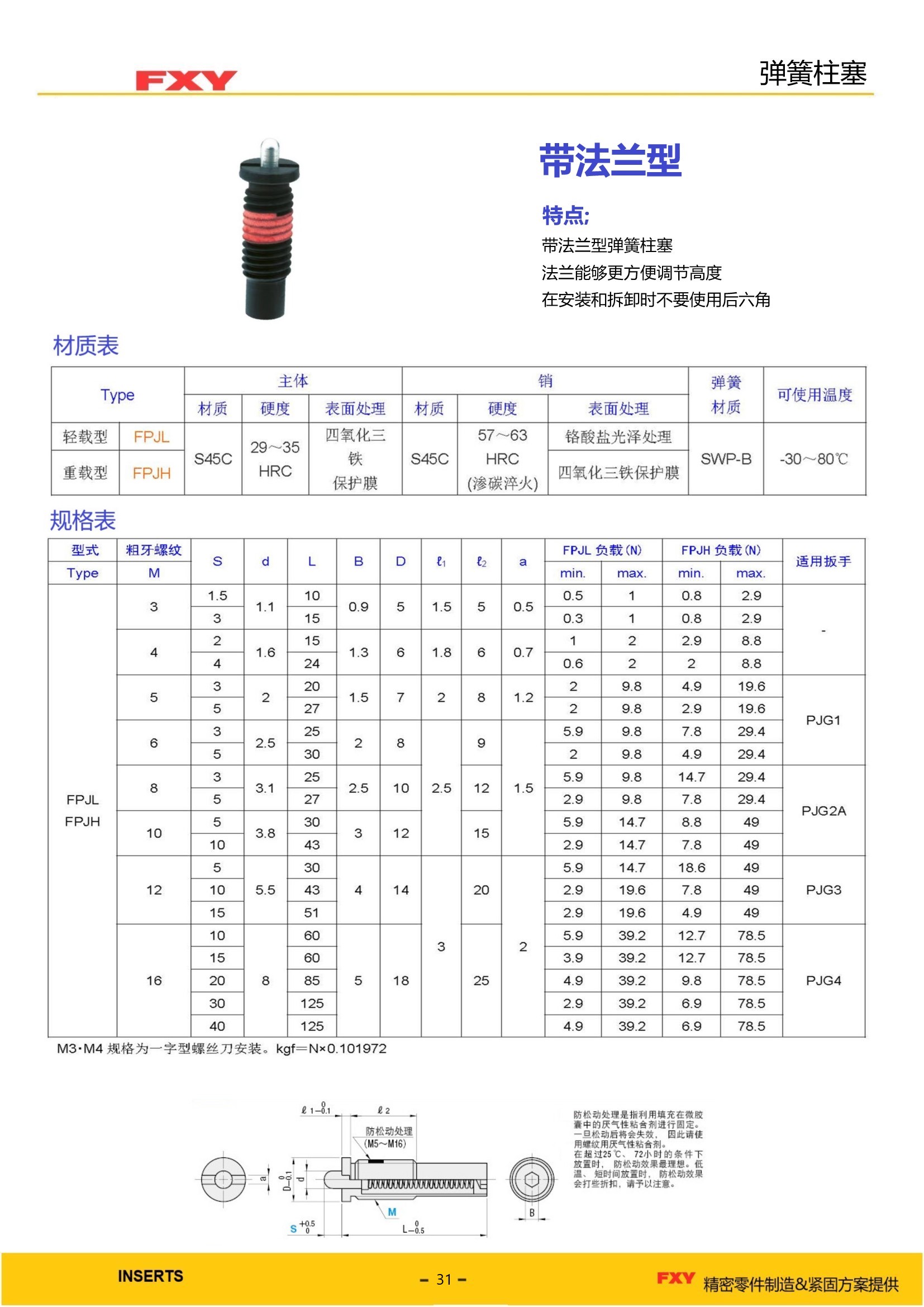 型号:带法兰型弹簧柱塞FPJL/FPJH 1、法兰更方便调节高度 2、在安装和拆卸时不要使用后六角