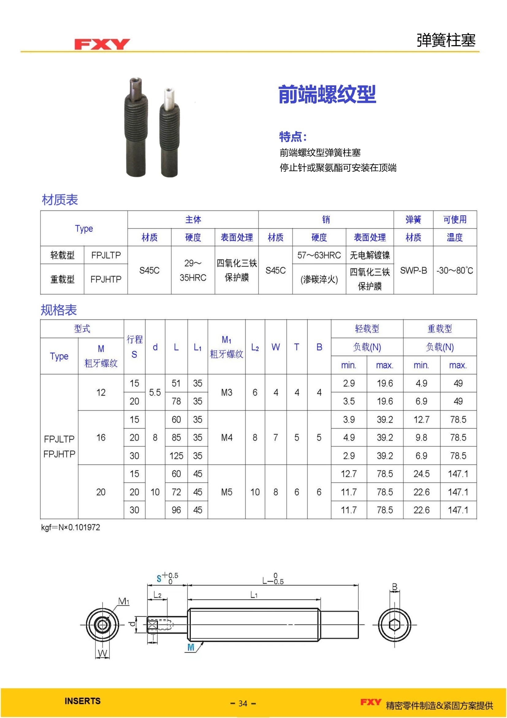 型号:前端螺纹型弹簧柱塞FPJLTP/FPJHTP 1、停止针或聚氨酯可安装在顶端