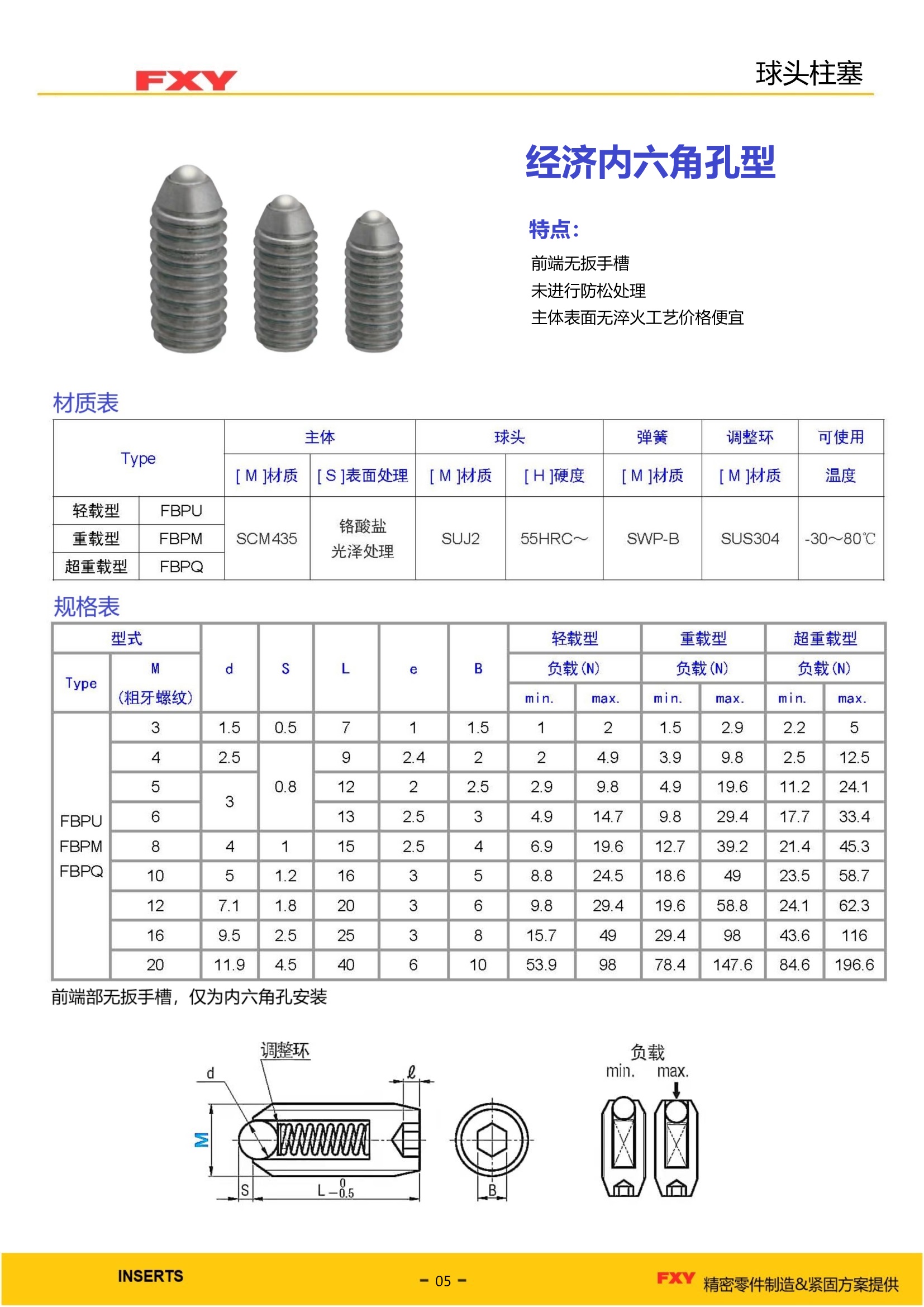 型号:球头柱塞经济内六角FBPU/FBPM/FBPQ型技术特点: 1、前端无扳手槽 2、未进行防松处理 2、主体表面无淬火工艺价格便宜