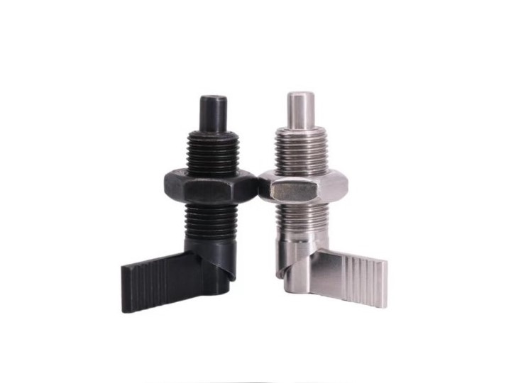 型号;旋钮柱塞粗牙螺纹把手型; 1、转动把手即可控制销进出 2、可在没有旋钮拉出空间使用 3、把手转动180°即可将销置于主体内通过凹槽锁定把手